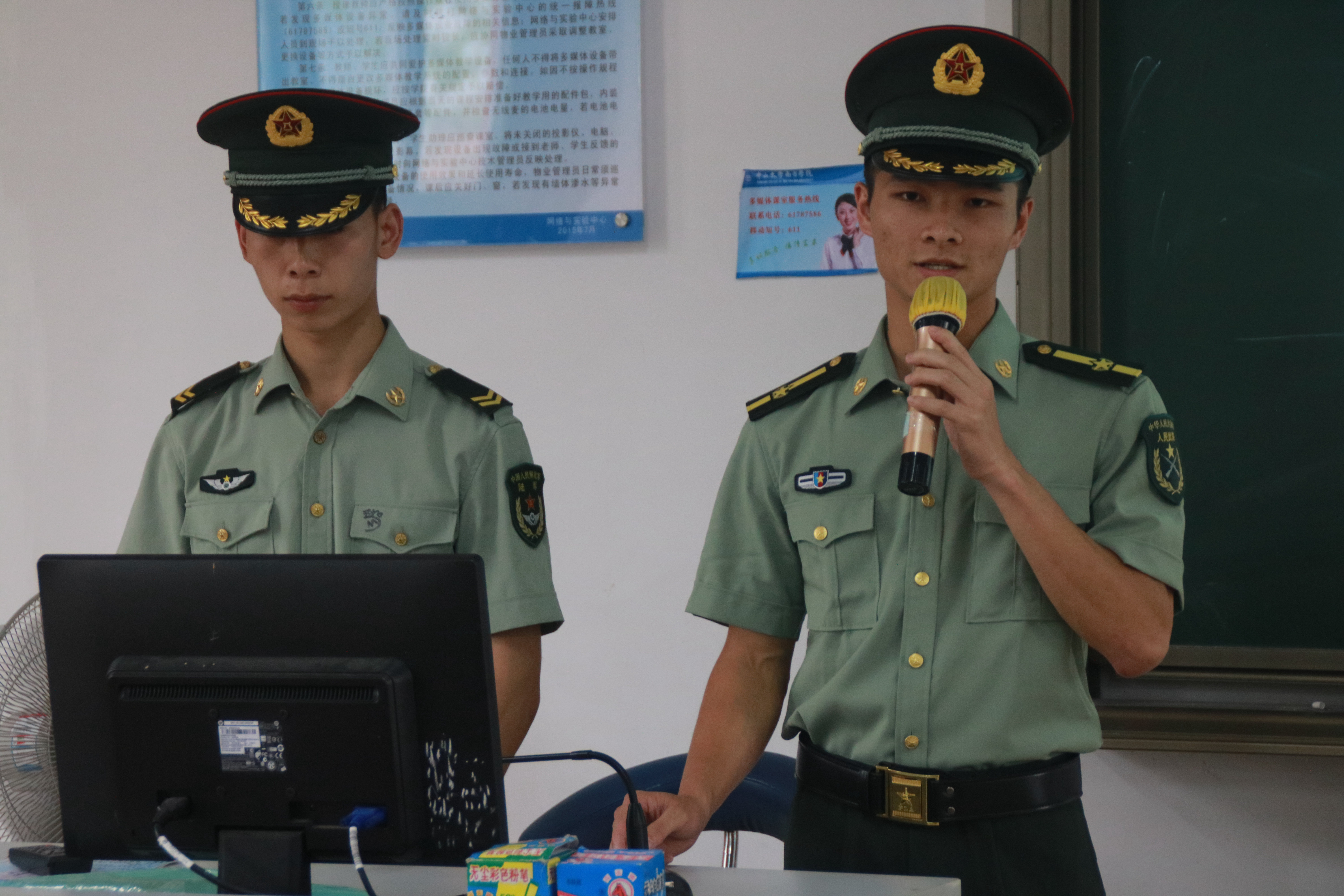 孙培高教官以我国当前面临的严峻的国际形势突出军队的重要性,并讲解中国现役武装力量的组成。为了让同学们更加深入地了解国家征兵政策以及各项参兵事宜,胡洪康教官详细介绍了国家对于大学生参军出台的系列政策,包括大学生服役期间和退伍后的优惠政策。