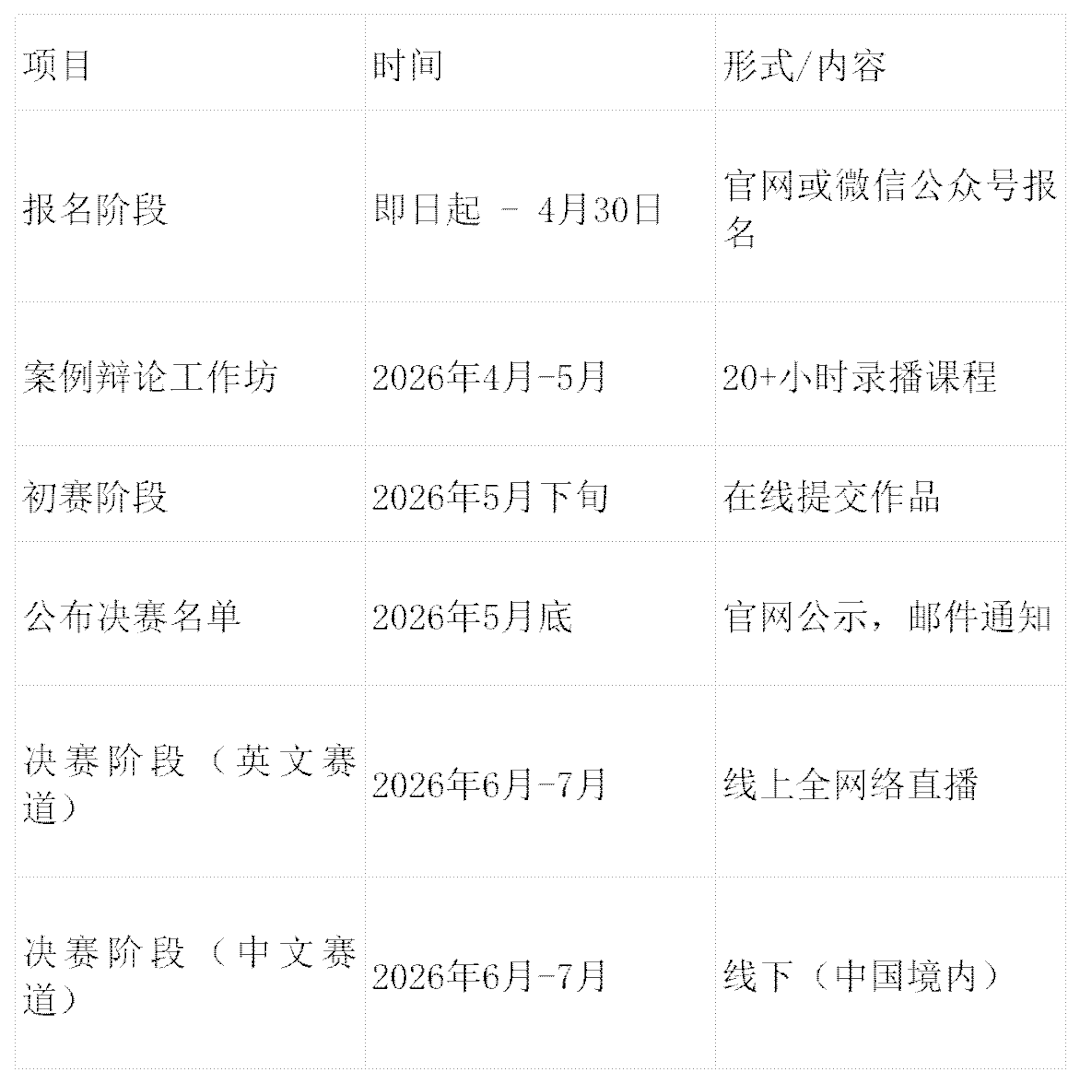 中文赛道:线下举行(中国境内),设有 “48小时挑战” 环节,48 小时内提交《案例角色及辩题确认表》。