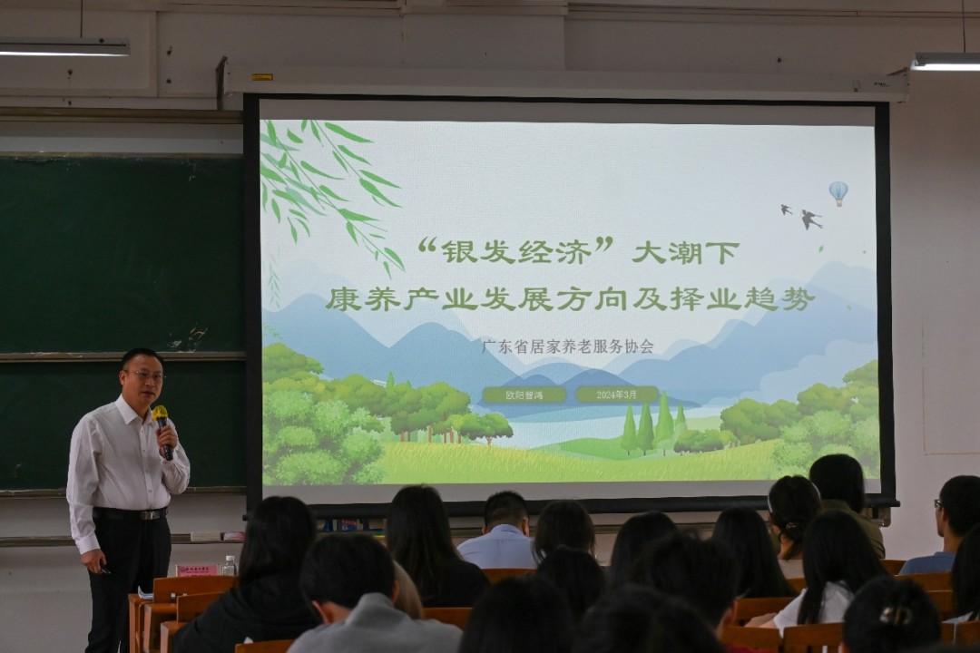 3月27日下午,我院有幸邀请到政协广州市委员会常委、广东省居家养老服务协会执行会长兼秘书长、民革中央人口资源环境委员会委员欧阳智鸿先生来院作题为“‘银发经济’大潮下康养产业发展方向及择业趋势”的专题讲座。讲座由williamhill中文经济系梅旭照副教授主持,williamhill中文副院长张玉冰教授、顾宇副教授、郭佳老师、郑璐老师等近200名师生到场聆听。