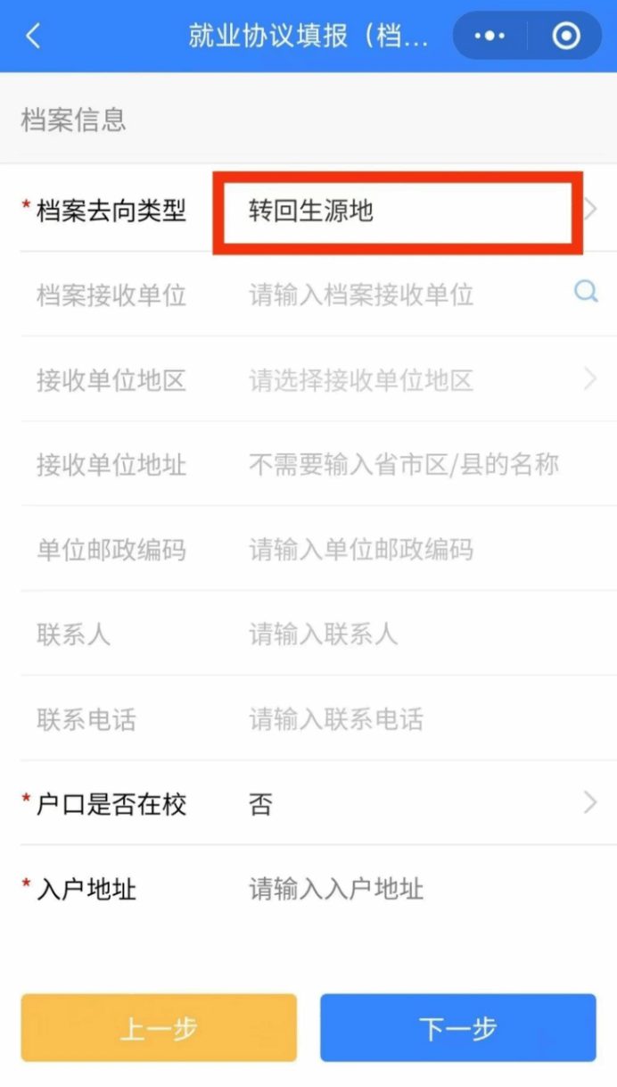档案去向类型共分四类:转回生源地、签约单位接收、托管单位接收、上级主管部门接收。建议在签约前和单位沟通清楚档案、户口去向及主管单位、报到地址、具体派遣单位等信息。档案去向一般选择“回生源地”,若档案去向为非“回生源地”,务必核实单位是否有接收档案权限;务必核实单位是否愿意接收档案,两个条件同时满足方可。
