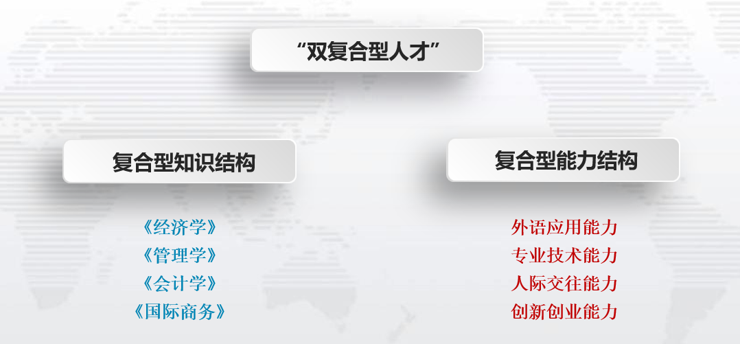 国际商务专业紧密围绕“厚基础、宽领域、重应用、高技能”的培养目标,培养具有扎实经济学和管理学理论基础,具有较强企业国际化经营管理实践能力和较强外语沟通交流能力的“双复合型人才”,即“复合型知识结构”和“复合型能力结构”。本专业以“专业+外语+技能+创业素质”为人才培养模式,采用模块化教学,重视发挥双语授课优势,旨在培养具有国际视野、本土情怀、创新意识、团队精神和沟通技能,能够在企事业单位、行政部门等机构从事国际商务工作的应用型、复合型、创新型人才。