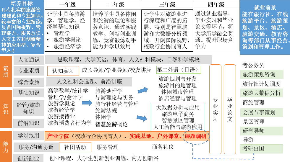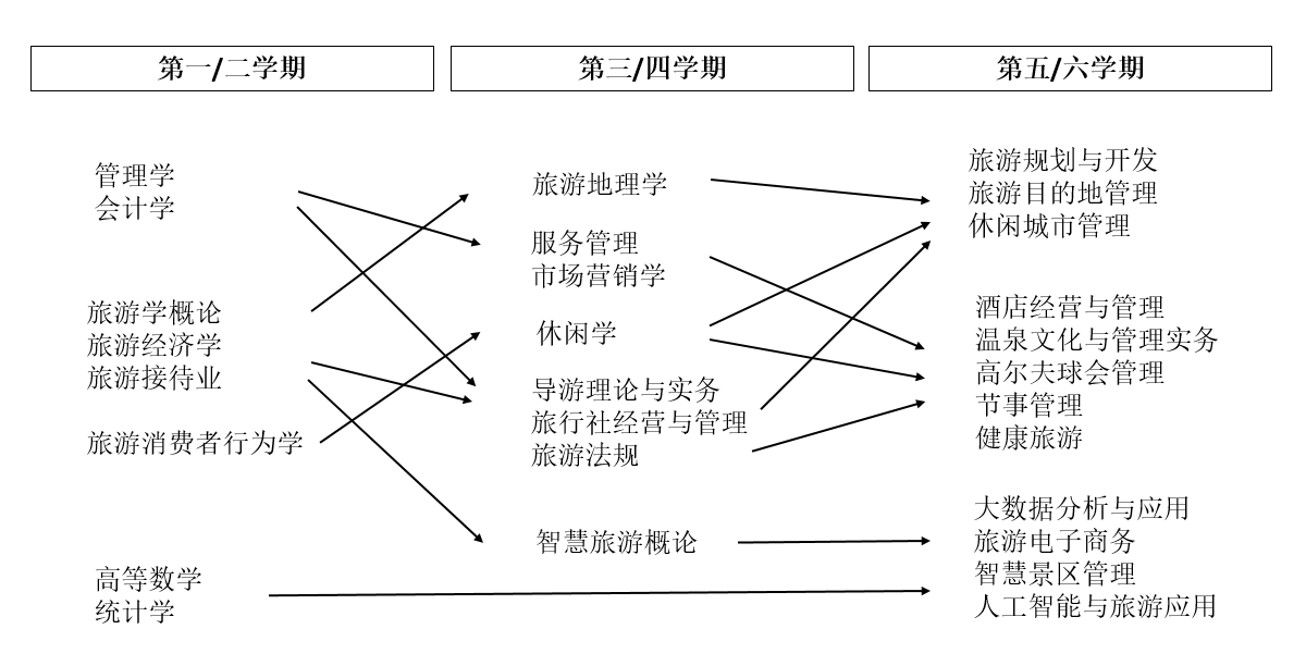 其中,核心课程包括旅游学概论、旅游经济学、统计学、旅游消费者行为学、旅游地理学、旅游法规、旅游目的地管理、旅游规划与开发、智慧旅游概论、旅游电子商务、旅行社经营与管理、导游理论与实务、大数据分析与应用等。