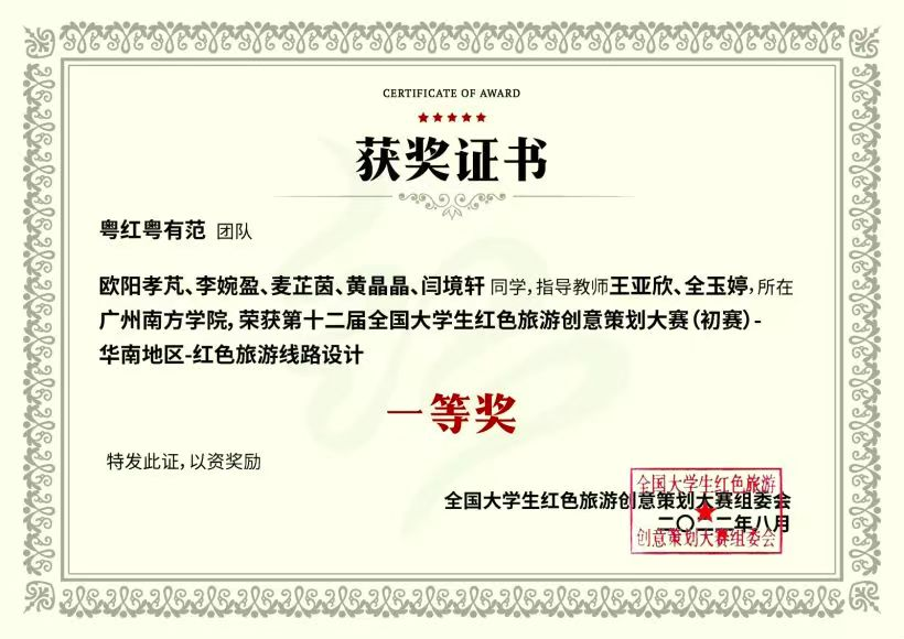 2016年,15级旅游管理专业学生李淑妍,徐楚欣组队参加华南农业大学举办的广东省第一届旅游线路设计大赛,获得一等奖。2020和2021年,本专业18和19级的学生组队分别获得第十届、第十一届全国大学生红色旅游创意策划大赛二等奖。2022年,在第十二届全国大学生红色旅游创意策划大赛中,我专业19级学生“粤红粤有范”队斩获大赛一等奖。